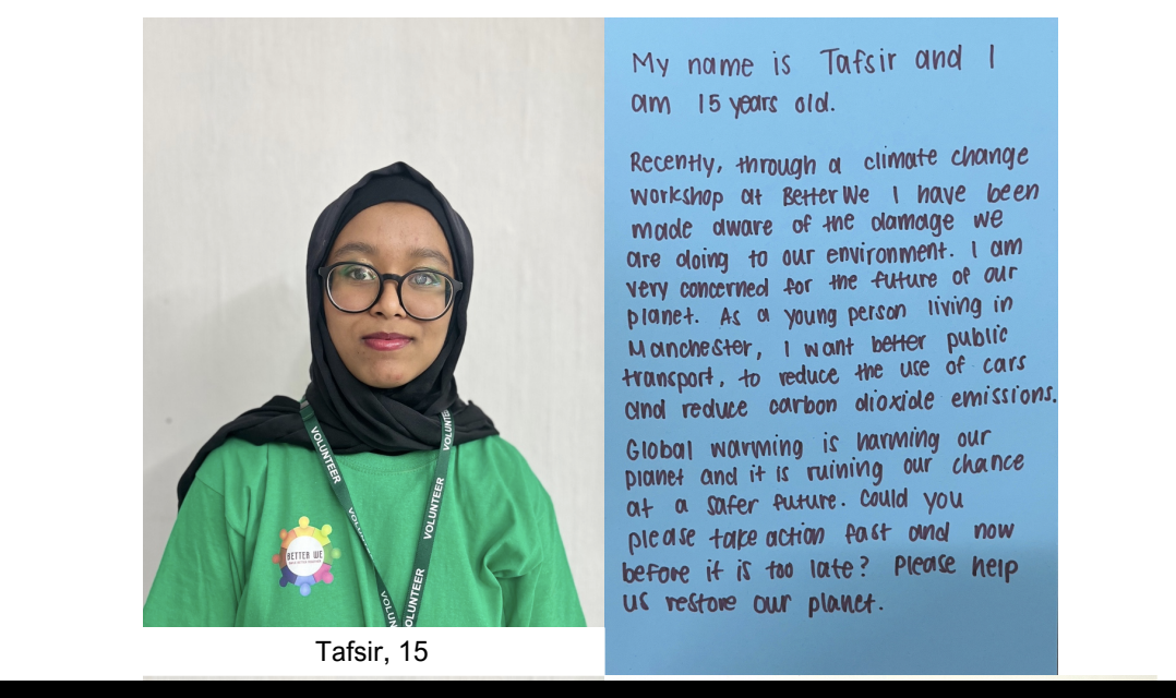 This three-day holiday workshop in Longsight offered local children—many with limited extracurricular opportunities—their first experience engaging deeply with climate issues. Around 20 children, initially shy, learned about climate change, climate injustice, and personal responsibility. Though they had briefly encountered climate change at school, the workshop provided clarity and hands-on activities including poster-making, quizzes, writing letters to the UN, and a street demonstration with climate slogans. The cold December air didn’t deter them. Girls who were initially hesitant became the most outspoken advocates by the end. Participants expressed excitement and a desire to join similar projects again, saying it was both fun and educational—a welcome break from their usual routines.