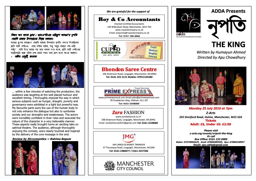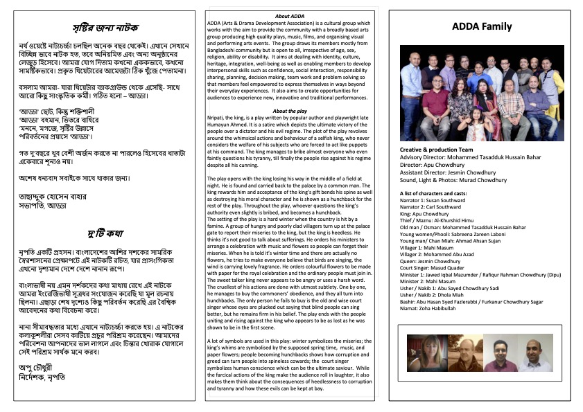 Synopsis: Written by Jesmin Chowdhury from her experiences and interactions in society, this play revolves around domestic violence and its effect on relationships and child development. The language of the play is an interesting mixture of Bengali, English and Sylheti as can be seen in many Bangladeshi households in the UK. Although the subject matter is quite grim with some serious messages, the author has created humour through her use of proverbs and dialogues. The play talks of not only the problems faced by women in abusive relationships, but also how they can help themselves and their families.
