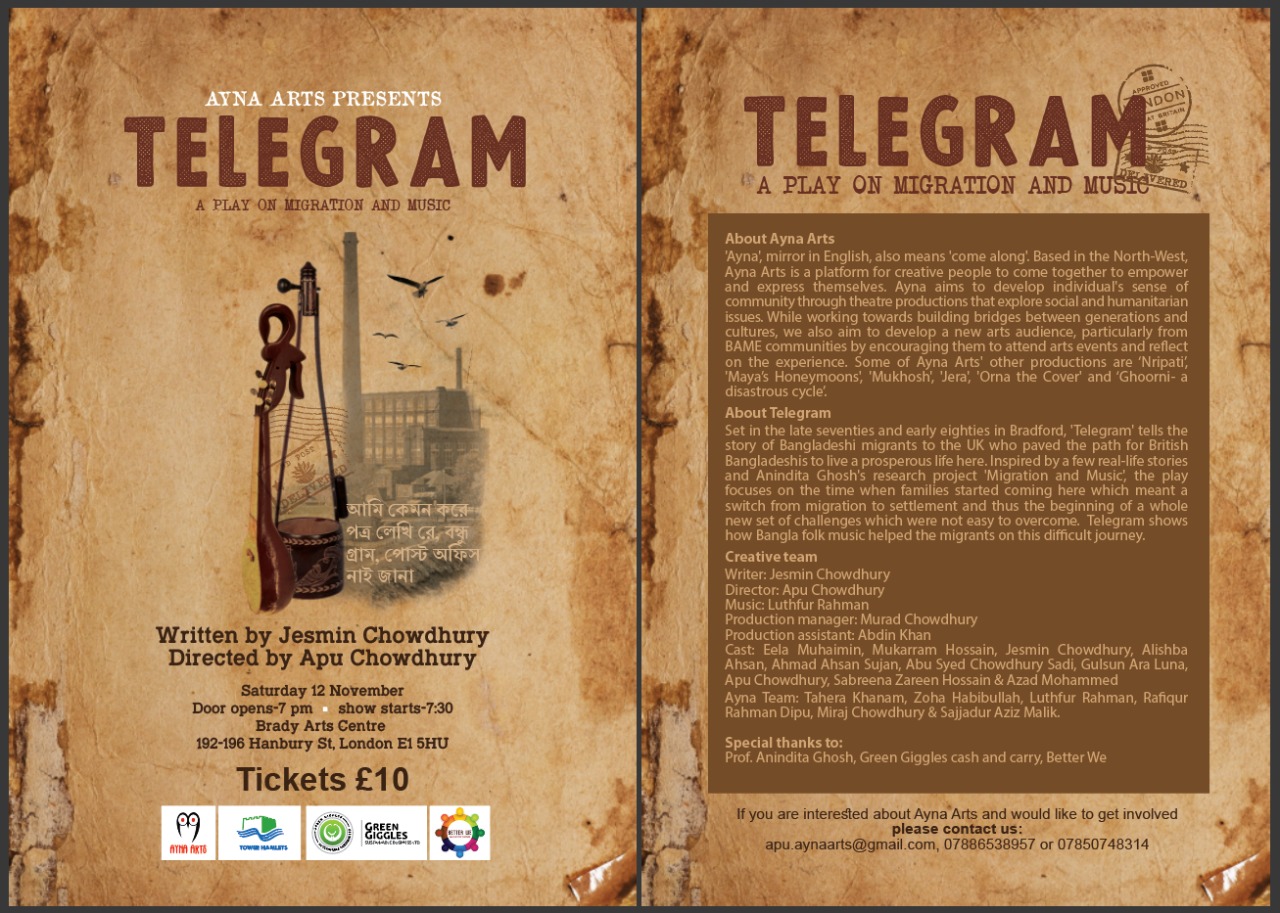 Synopsis: Set in the late seventies and early eighties in Bradford, ‘Telegram’ tells the story of Bangladeshi migrants to the UK who paved the path for British Bangladeshis to live a prosperous life here. Inspired by a few real-life stories, the play focuses on the time when families started coming here which meant a switch from migration to settlement and thus the beginning of a whole new set of challenges which were not easy to overcome. Telegram also shows how Bangla folk music helped the migrants on this difficult journey.